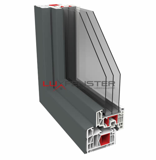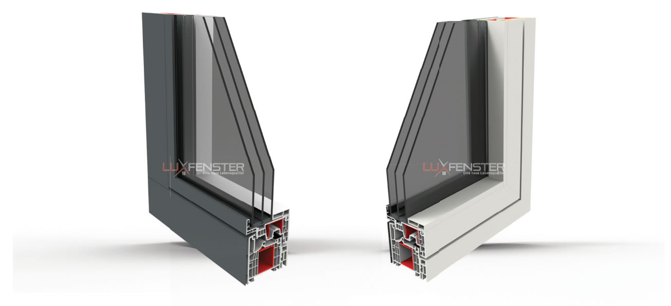 Mit der Aluminium-Vorsatzschale wird elegantes Aluminium-Design in nahezu unbegrenzter Farbvielfalt mit den optimalen Dämmwerten des modernsten Kunststoffprofil-Systems 88 LUX kombiniert. Mit seiner Eleganz, Witterungsbeständigkeit und Pflegeleichtigkeit überzeugt der Werkstoff Aluminium im Fensterbau. Kunststoff hingegen bietet eine optimale Wärme- und Schalldämmung sowie hohe Funktionssicherheit.